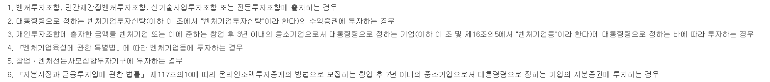 제16조(벤처투자조합 출자 등에 대한 소득공제) ① 거주자가 다음 각 호의 어느 하나에 해당하는 출자 또는 투자를 하는 경우에는 2025년 12월 31일까지 출자 또는 투자한 금액의 100분의 10(제3호ㆍ