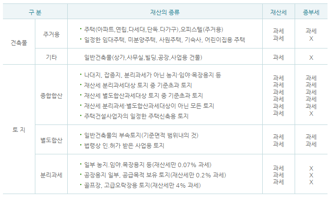 의의에서 보았듯이 종부세는 재산세 외에 추가로 부과되는 세금입니다. 종부세 과세대상인 주택과 토지는 재산세 과세대상인 주택과 토지를 말하며, 종부세 과세기준일도 재산세 과세기준일과 동일하게 매년 6/1입니다.